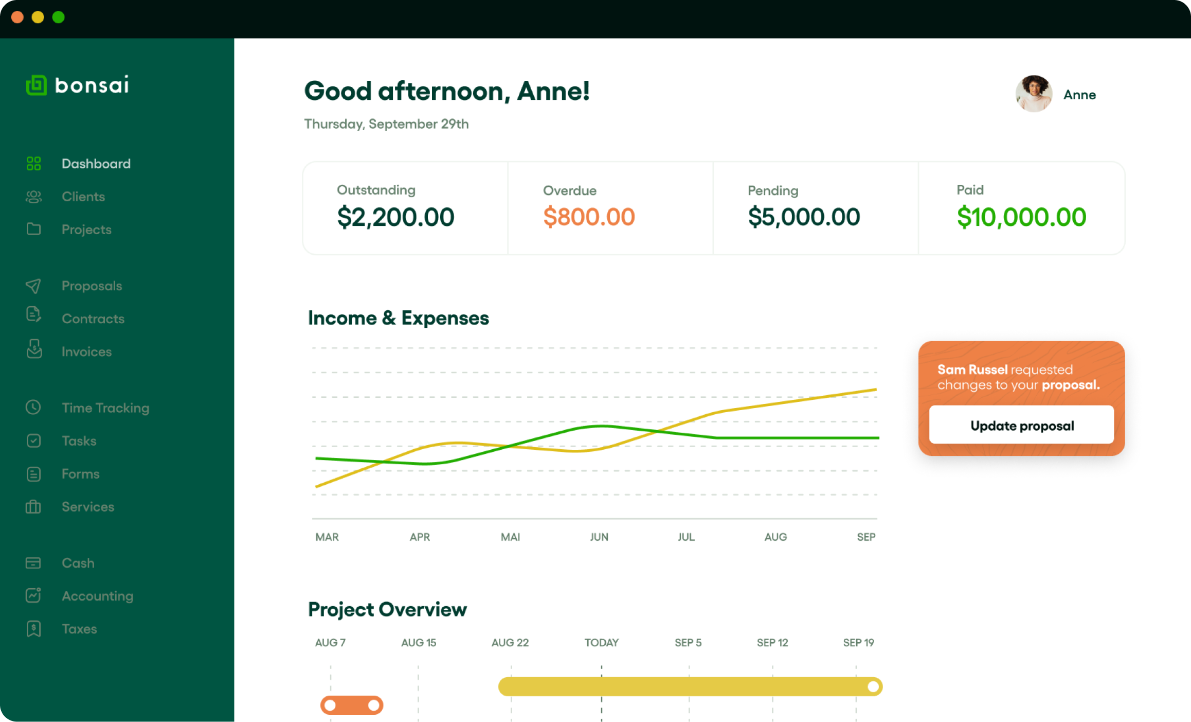 With Bonsai, I can manage employees, create contracts, track time, deliver invoices, and receive payments all in one piece of software. It’s exactly what I was looking for.