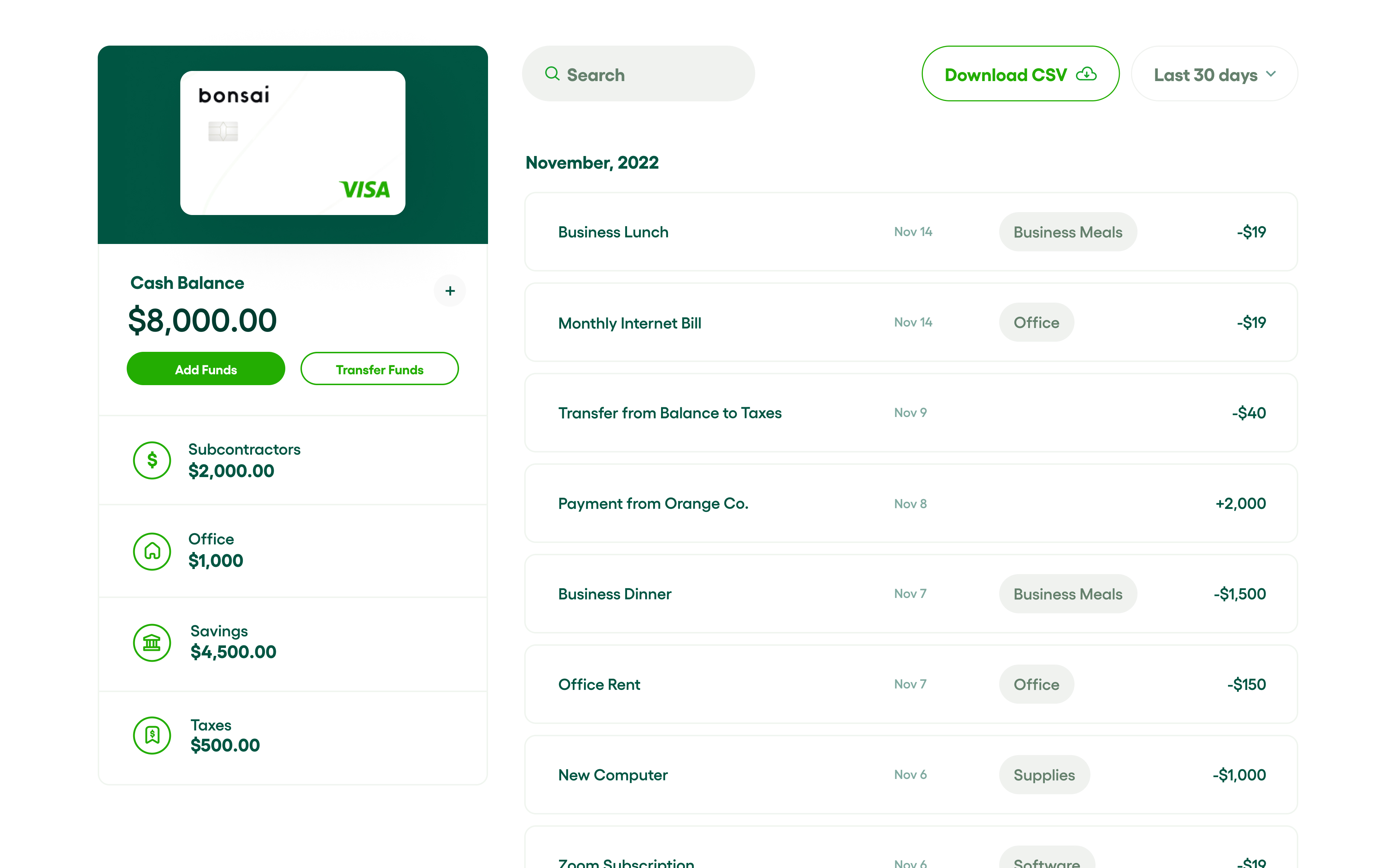 Nossa nova conta empresarial para freelancers, a conta empresarial da Bonsai, pode ajudá-lo a separar suas despesas comerciais das pessoais. Se você não tiver uma conta corrente empresarial, será difícil comprovar as despesas pessoais das despesas comerciais caso seja auditado.