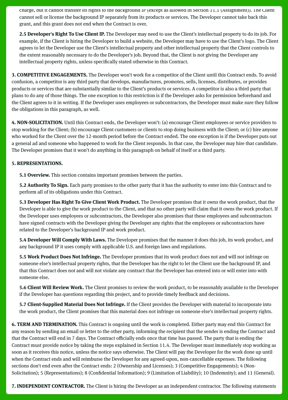 This Contract is ongoing until the work is completed. Either party may end this Contract for any reason by sending an email or letter to the other party, informing the recipient that the sender is ending the Contract and that the Contract will end in 7 days. The Contract officially ends once that time has passed. The party that is ending the Contract must provide notice by taking the steps explained in Section 11.4. The Developer must immediately stop working as soon as it receives this notice, unless the notice says otherwise. The Client will pay the Developer for the work done up until when the Contract ends and will reimburse the Developer for any agreed-upon, non-cancellable expenses. The following sections don’t end even after the Contract ends: 2 (Ownership and Licenses); 3 (Competitive Engagements); 4 (Non-Solicitation); 5 (Representations); 8 (Confidential Information); 9 (Limitation of Liability); 10 (Indemnity); and 11 (General).