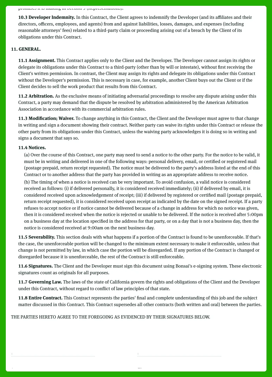 11.6 Signatures. The Client and the Developer must sign this document using Bonsai’s e-signing system. These electronic signatures count as originals for all purposes.