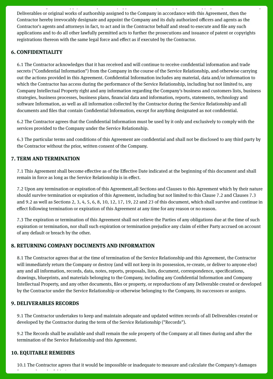 6.2 The Contractor agrees that the Confidential Information must be used by it only and exclusively to comply with the services provided to the Company under the Service Relationship.
