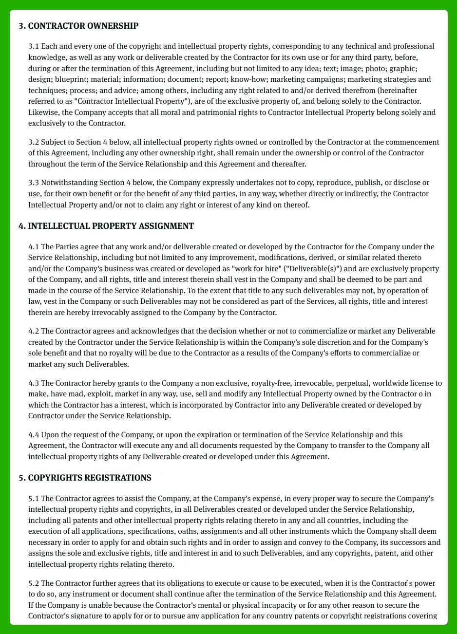3.2 Subject to Section 4 below, all intellectual property rights owned or controlled by the Contractor at the commencement of this Agreement, including any other ownership right, shall remain under the ownership or control of the Contractor throughout the term of the Service Relationship and this Agreement and thereafter.