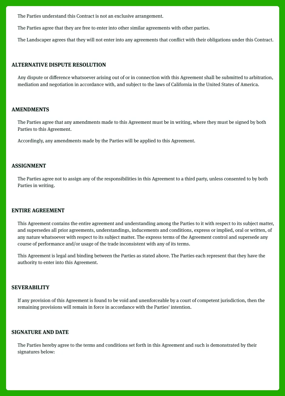 Include your terms and work condition, whether a one-time job or recurring service, stating the period or appropriate timeframe. Your landscape design contract terms should also state the requirements for termination.