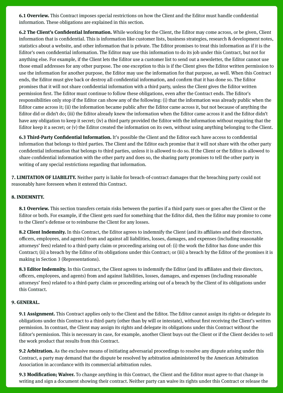 In a Video Editor Contract Template, the standard legal boilerplate keeps both editors and clients protected and on the same page. This section breaks down confidentiality, representations, limited liability, indemnification, severability, amendments, governing law, and notices with practical explanations that simplify what each clause means in real projects.