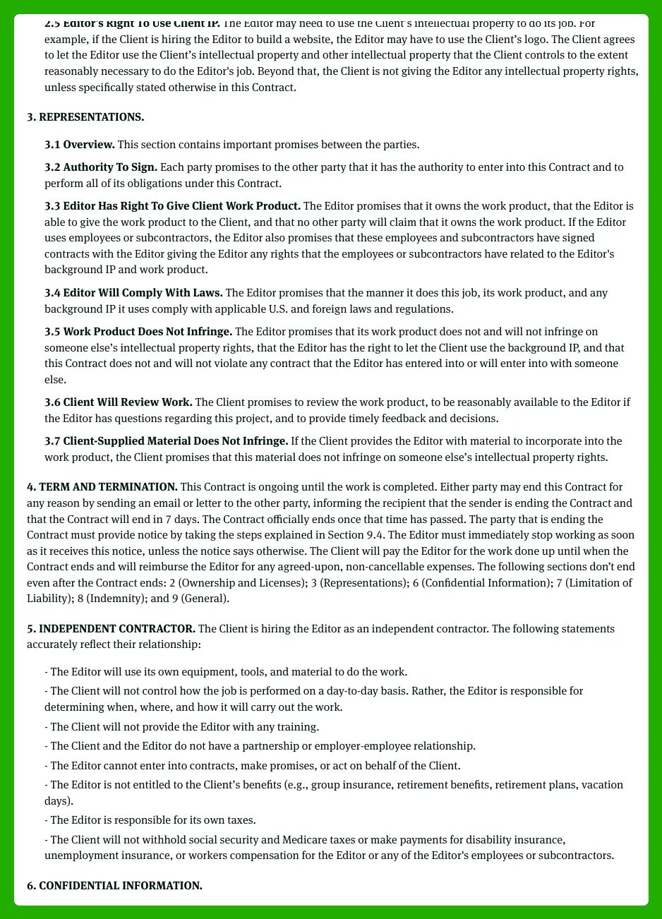 The editor warrants they have the necessary skills, licenses, and rights to perform the services and that the work will comply with applicable laws and industry standards. They also warrant that the materials they provide, such as fonts, templates, or stock assets they own or have rights to use, won’t infringe third-party rights. This reduces the risk of unexpected claims and clarifies accountability if issues arise. The client, in turn, warrants that they own or have the rights to all materials they supply, including footage, music, logos, and scripts, and that those assets are either created by the client or properly licensed for the project.