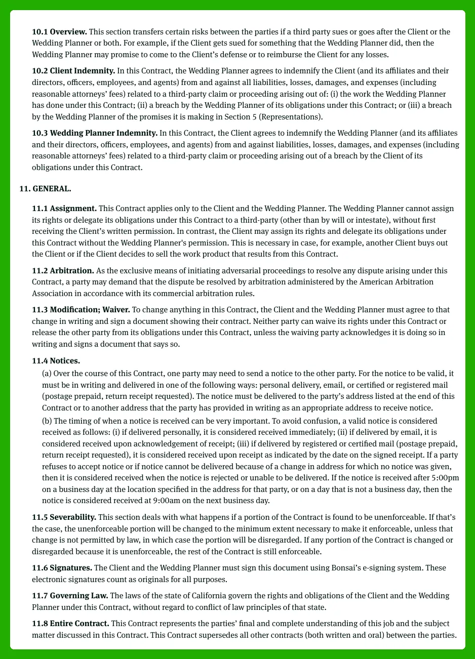 The template is very comprehensive. It talks about everything you need to include in a professional wedding planner contract and even helps you understand what edits you’ll need to make to fit it to your situation.