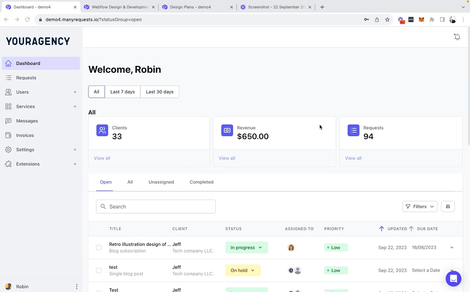 Manyrequests est un système de gestion de la clientèle spécialement conçu pour les entreprises de services, qui contribue à améliorer la structure, la communication et les processus de travail. C'est un endroit où les entreprises peuvent rassembler et contrôler les demandes des clients, les délais des projets, les paiements et la communication. ManyRequests est utile aux agences, aux freelances individuels et aux entreprises proposant des services par abonnement, car il permet l'intégration des clients, la gestion d'un système de tickets et la collaboration, le tout sans changer d'outil.