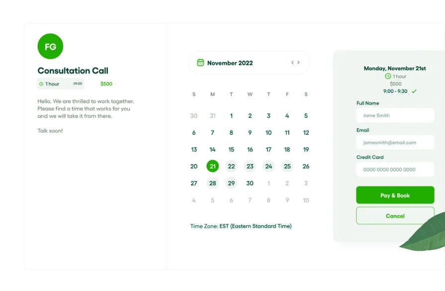 Time-tracking software may have the ability to show clients your availability, too. Bonsai’s scheduling software, pictured below, allows clients to book meetings that will never overlap or interrupt critical project tasks. Scheduling tools like this help your teams stay productive while promoting an image of availability and supportiveness to your customers.