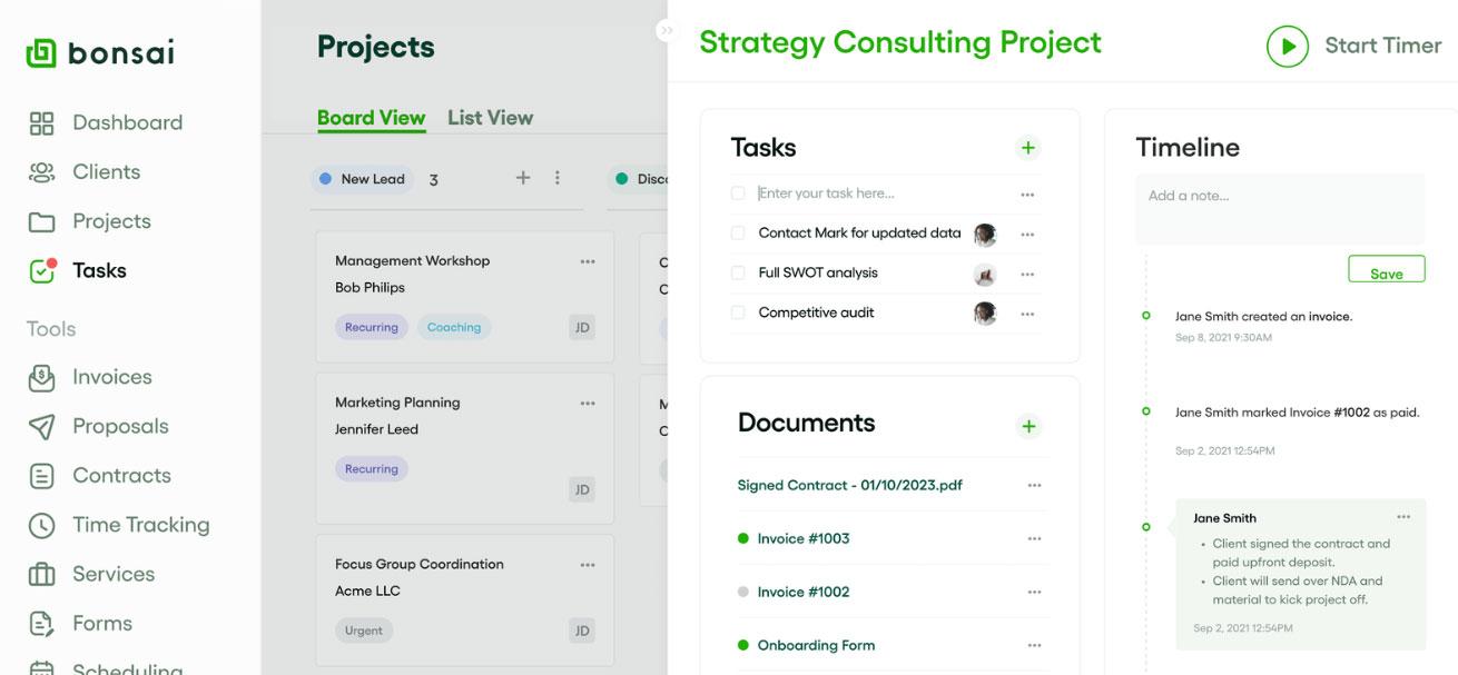 Bonsai offers a range of templates that can help with the acquisition of clients, from proposals and quotes to feedback forms. If a client decides not to go with you, it’s helpful to understand why. You can use this information to drive process improvement or even adjust the services you offer. Recording both success and failure helps hone your strategy and encourages a focus on accountability.