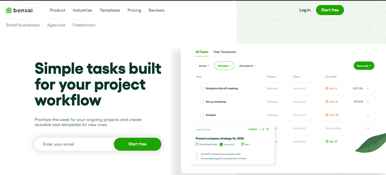 Our platform, Bonsai, is designed to be the perfect all-rounder. It's a platform for every department, from HR to accounting to sales, and offers a robust set of features for both project management and financial operations.