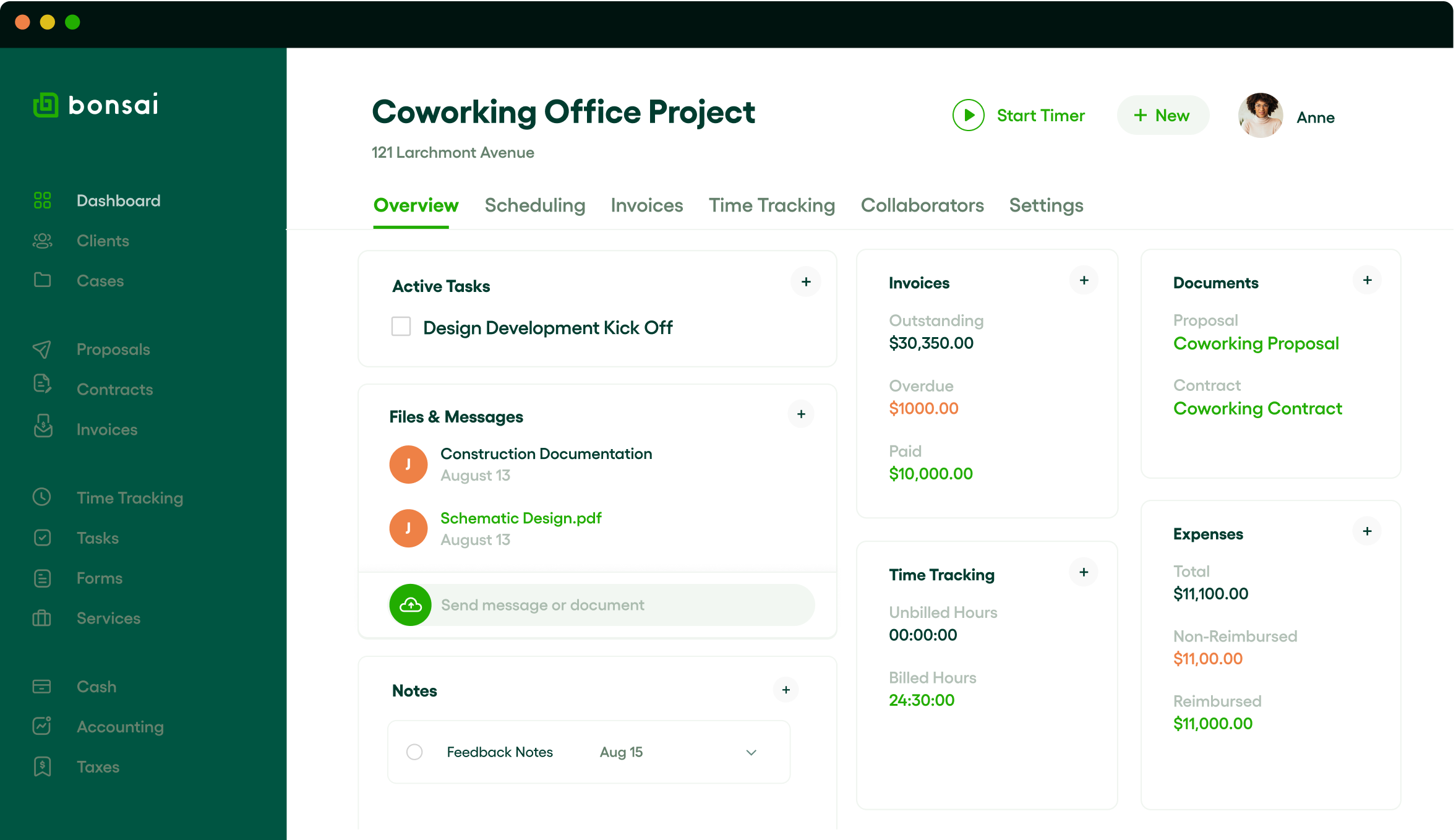 The Bonsai Online Freelance tools suite can be a great asset to the financial part of your architectural business. You may create proposals based on the project that you have in mind, giving your client a better idea of the costs involved in this task. It can also help you with architecture invoicing and fees, ensuring you always receive your payment on time.