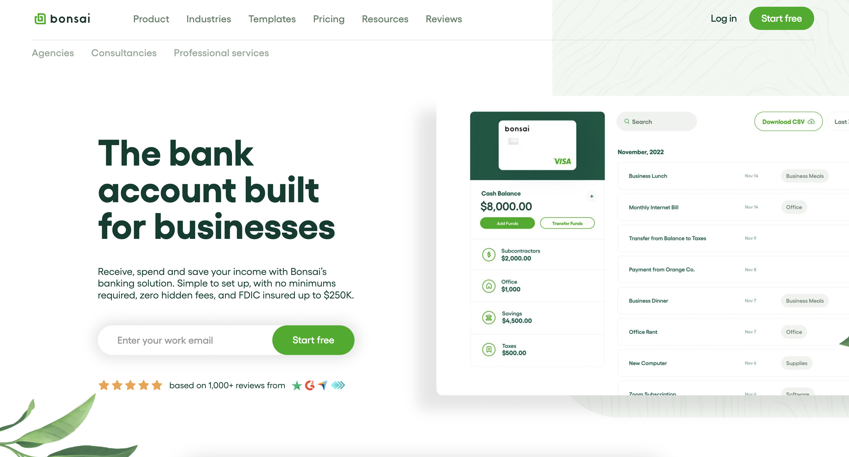 Bonsai's business account is an online small business checking account that allows you to manage your spending, your funds, and your business savings.