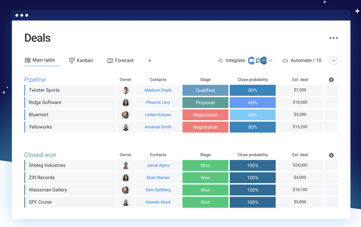 Monday is a project management and team collaboration tool that can be used as a CRM for managing projects, tasks, and team communication.