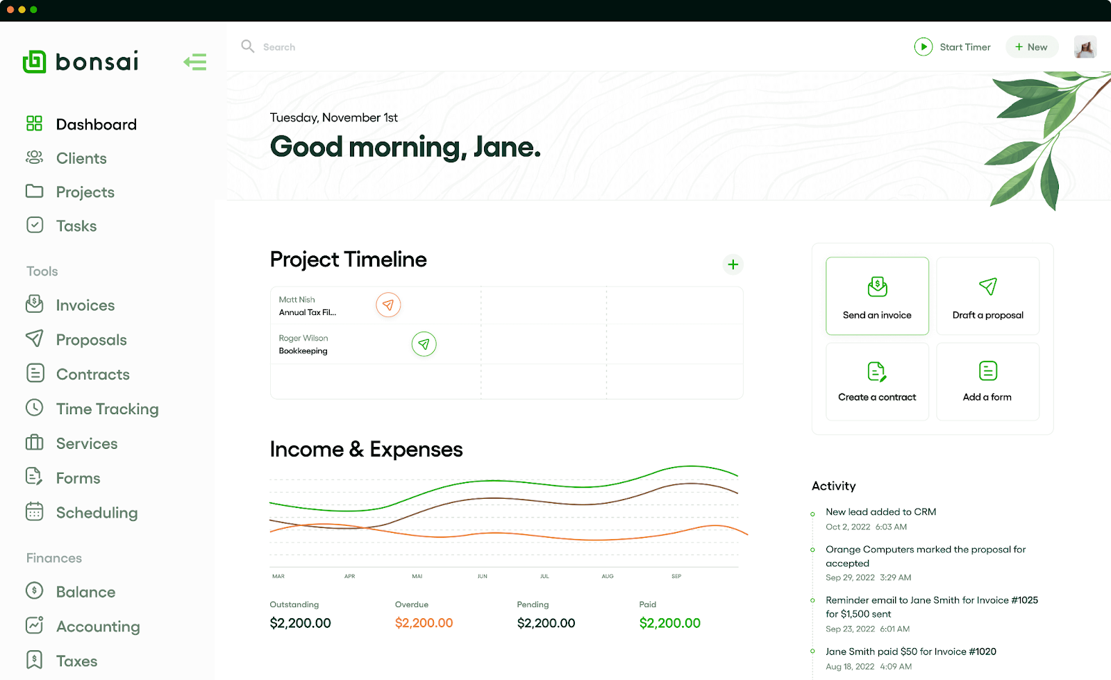 Our own CRM solution, Bonsai, is built to be the all-in-one business solution for self-employed businesses. It's got tools for workflow, finance, and client management. We've even got a client portal you can customize to give your clients a more personalized experience.