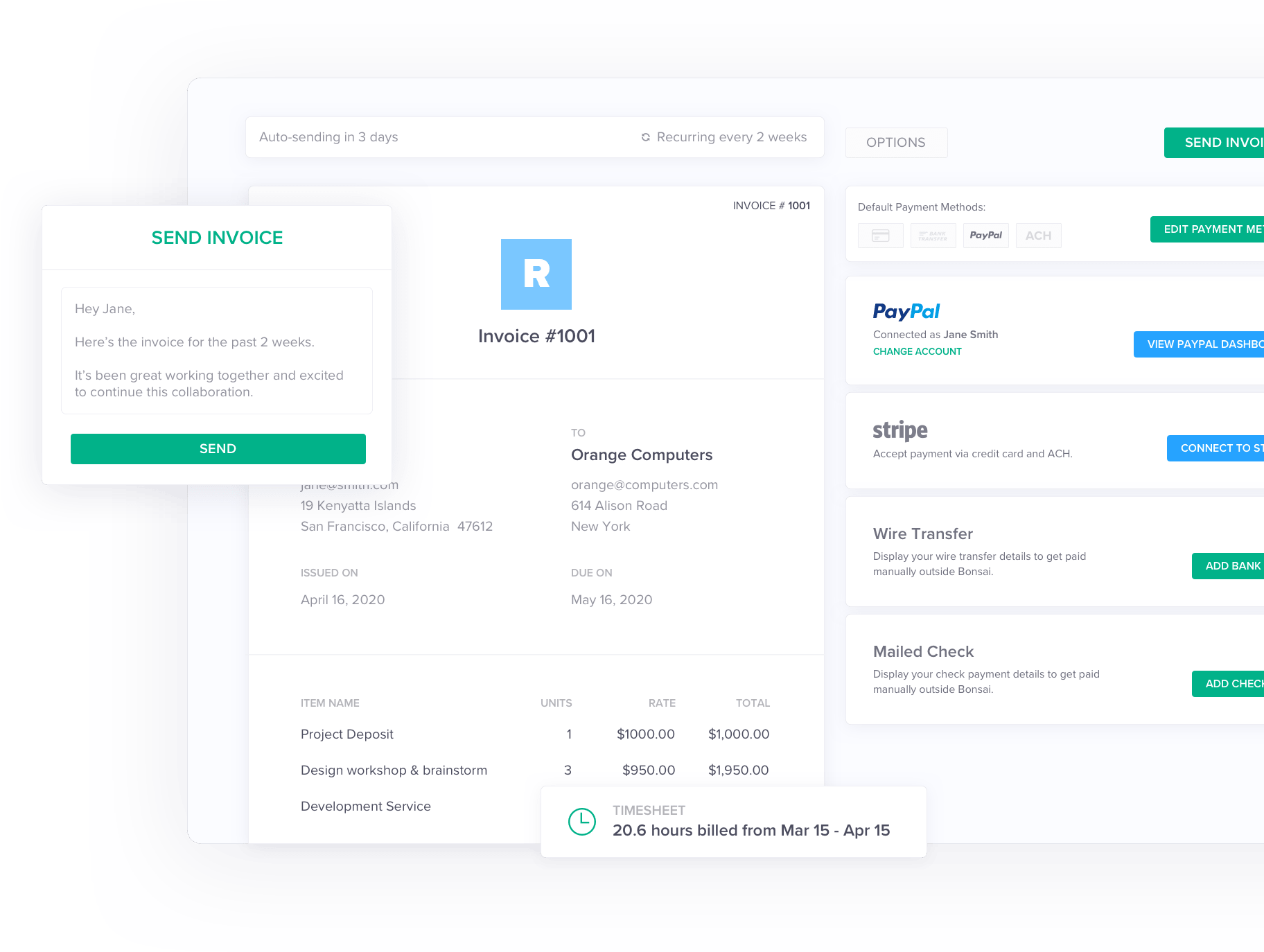 All Bonsai templates can be customized to fit your brand tone and style. Once you are signed up, Bonsai makes it easy to edit, create, and send your invoices and templates to your clients.