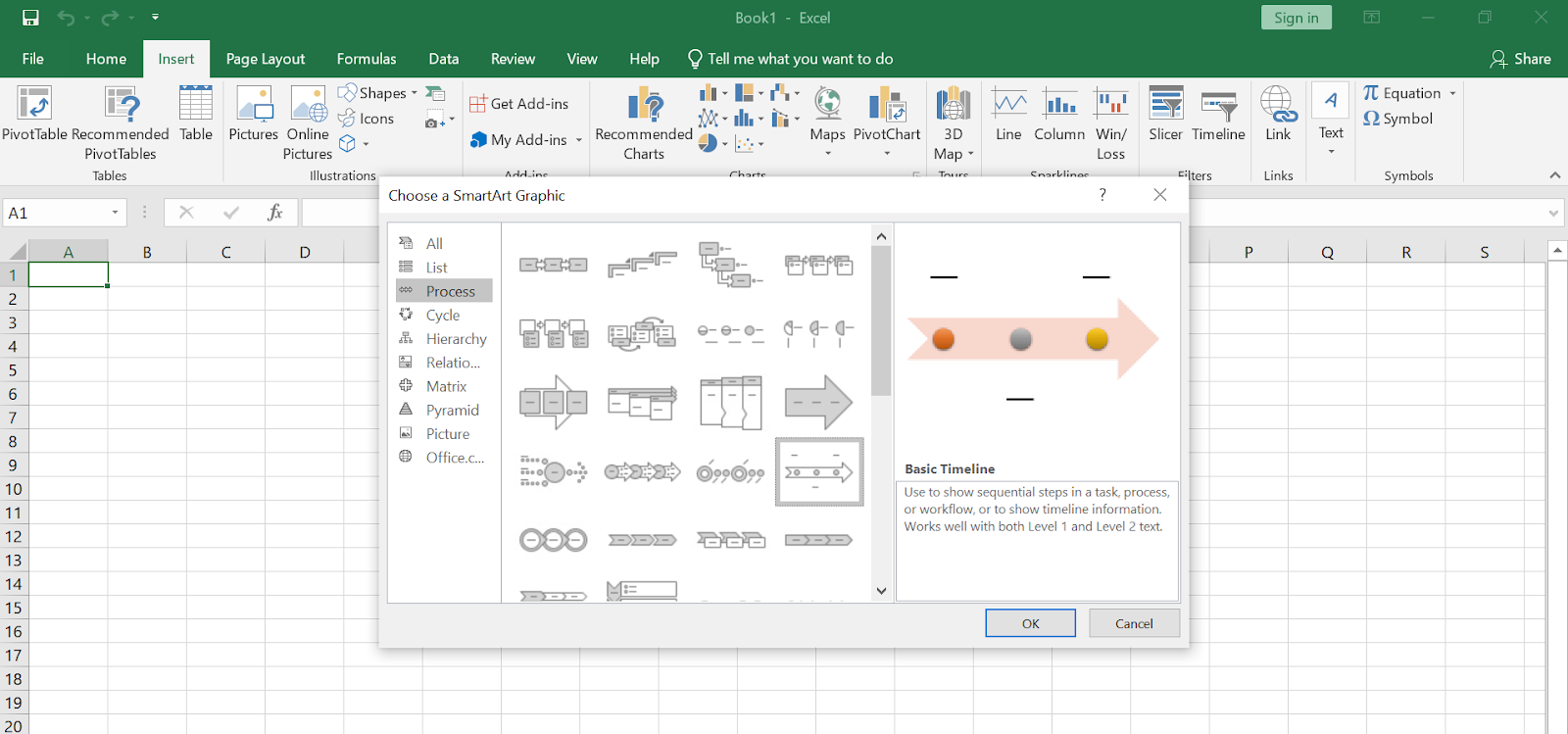 Tout comme Word, Microsoft Excel dispose déjà de modèles de chronologie pour faciliter et accélérer le processus de création. Ouvrez un nouveau document dans Excel, puis allez dans Graphiques SmartArt et sélectionnez « Chronologie de base ». À partir de là, vous pouvez ajouter les détails de votre projet et l'ajuster selon vos préférences.