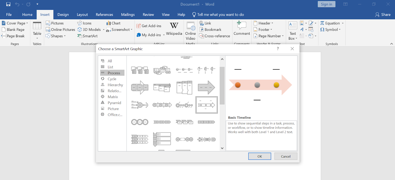 Après avoir créé un nouveau document, allez dans l'onglet « Insertion » et cliquez sur « SmartArt ». Ensuite, allez dans « Processus » et choisissez une mise en page parmi les différents formats proposés, tels que « Chronologie de base » ou « Chronologie simple ».