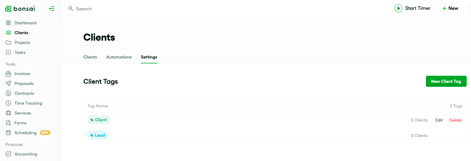 Notre propre plateforme, Bonsai, offre l'avantage d'être un outil tout-en-un. Inutile d'assembler cinq plateformes différentes : gérez tous vos besoins en matière de CRM client, de comptabilité et de gestion de projet à partir d'un tableau de bord intuitif.