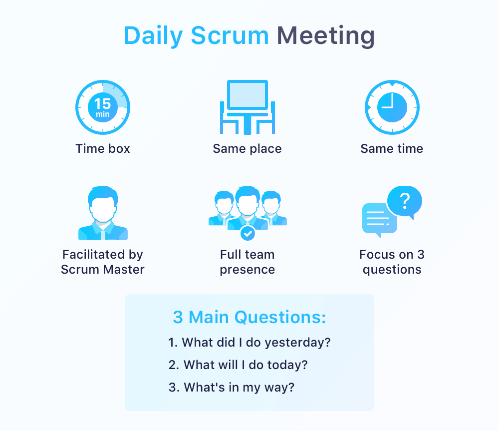 Au cours des réunions quotidiennes Daily Scrum Standups, trois questions essentielles guident la discussion, favorisant la synchronisation et la clarté entre les membres de l'équipe :