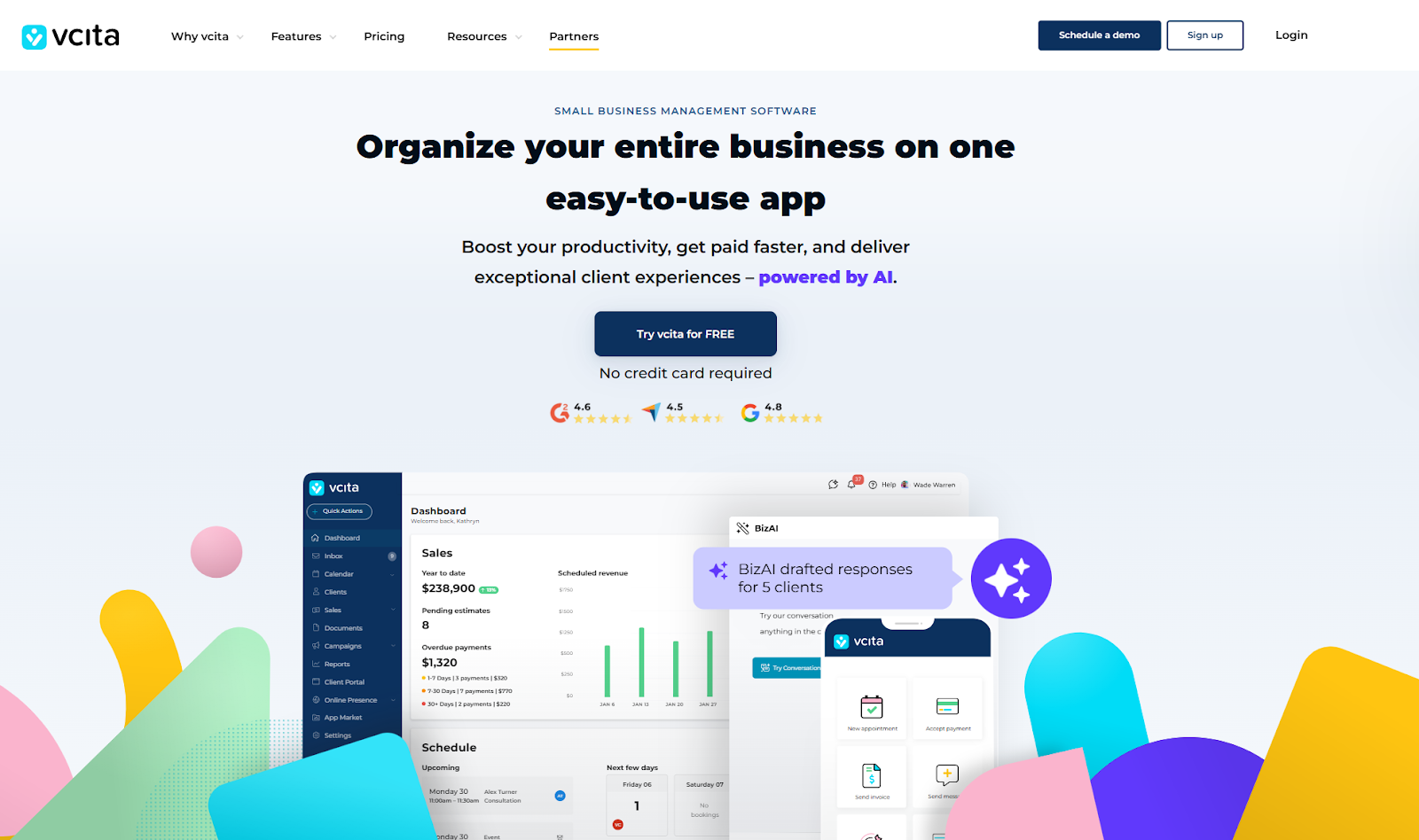 vcita is an all-in-one platform for service-based SMBs that bundles CRM, online scheduling, invoicing/payments, a branded client portal, and BizAI, an embedded assistant that drafts replies, proposes meeting times, builds estimates, and surfaces actionable insights. vcita centralizes client data and daily workflows so you can book faster, get paid sooner, and keep every conversation in one place. It’s simple enough for solo pros yet powerful for growing teams, with mobile apps and integrations that slot neatly into the stack you already use. vcita is a good alternative to dubsado thanks to its native client portal, robust scheduling, and AI features available on every plan.