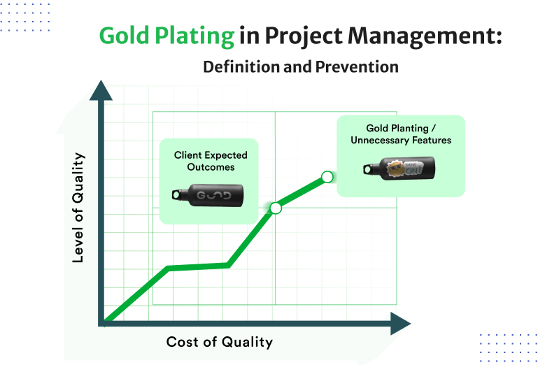 Dans la gestion de projet, le « gold plating » désigne le fait pour l'équipe d'ajouter des fonctionnalités supplémentaires ou d'effectuer des tâches qui dépassent le cadre convenu. Cela va au-delà des besoins du client et n'entraîne souvent pas de coûts supplémentaires, ce qui peut perturber le budget et le calendrier. Bien que cela puisse sembler une bonne idée, cela entraîne souvent des problèmes tels que des risques accrus, des dérives de périmètre et des retards. Il faut une approche solide en matière de gestion du changement pour éviter de s'écarter des exigences du projet. Ainsi, pour une gestion efficace, il est important d'éviter le surdimensionnement.