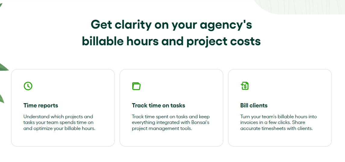 Bonsai offre de nombreuses fonctionnalités, notamment un logiciel CRM, un produit de gestion financière, un outil de suivi du temps et un outil de gestion des sous-traitants. Combinées, ces fonctionnalités sont conçues pour aider votre agence à se développer.