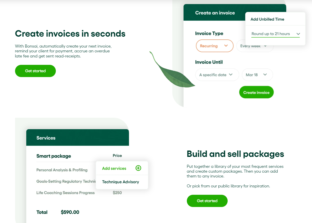 Le logiciel de facturation automatisé de Bonsai permet aux agences de créer et de vendre des forfaits à leurs clients (Logiciel de facturation pour entreprises - Factures en ligne - Bonsai (hellobonsai.com))