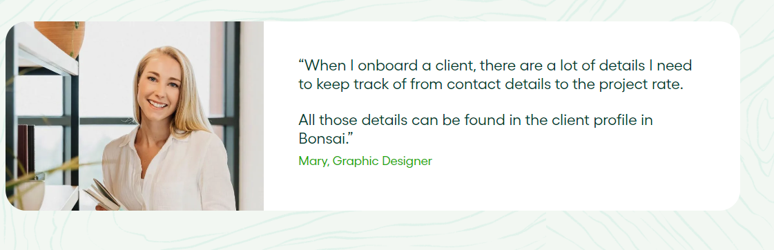 À mesure que votre agence se développe, cela devient encore plus important. Plus de clients signifie plus de données. Mais avec la technologie CRM de Bonsai, il n'y a aucune limite au nombre de profils clients pouvant être ajoutés. Cela signifie que Bonsai permet aux agences de se développer sans avoir à investir dans des logiciels supplémentaires comme elles le font.