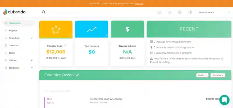 Dubsado est une solution populaire de gestion d'entreprise et de gestion de projet, et une bonne alternative à HoneyBook. Il dispose d'un tableau de bord qui rend compte et affiche les ventes, les revenus, les dépenses et les bénéfices nets au fil du temps, ce qui le rend efficace pour les petites entreprises et les travailleurs indépendants.
