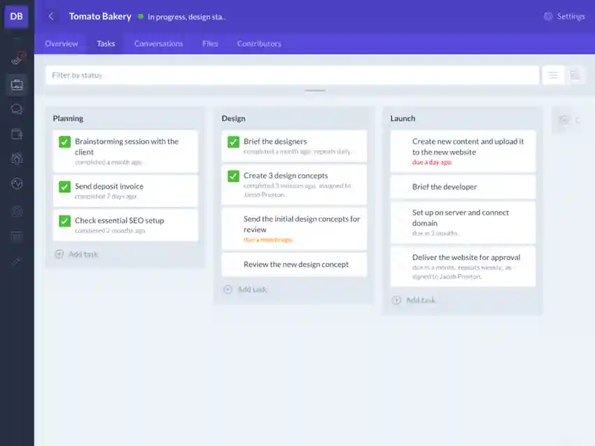 Plutio est une autre plateforme idéale pour les freelancers et constitue une excellente alternative à HoneyBook. Il intègre plusieurs fonctionnalités telles que la gestion de projet, les tâches et le suivi des factures dans un seul tableau de bord, ce qui est idéal pour ceux qui gèrent de petites entreprises. Il vous permet également de créer des propositions et des contrats à l'aide d'un outil glisser-déposer facile à utiliser, ce qui facilite la gestion des projets.