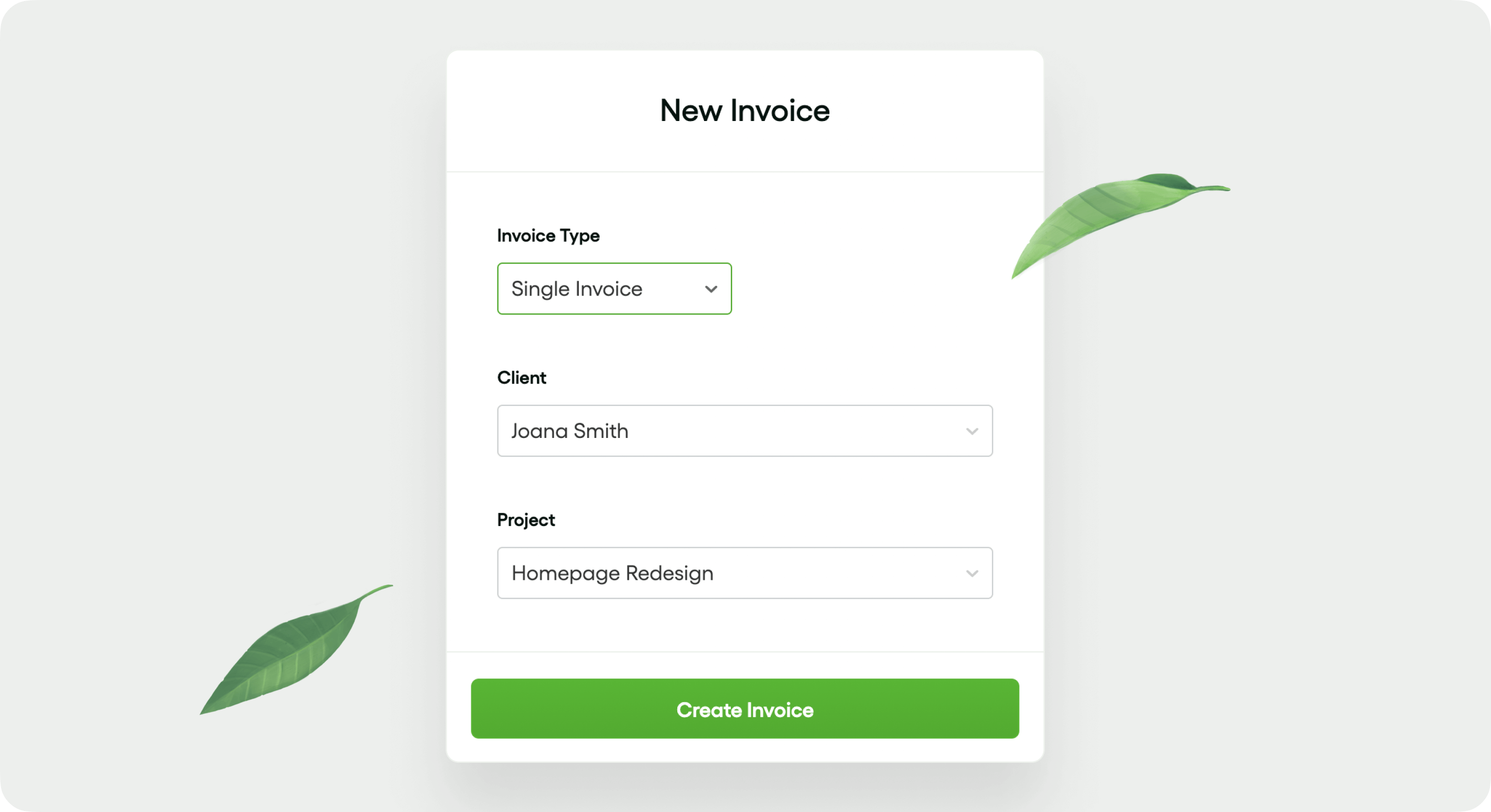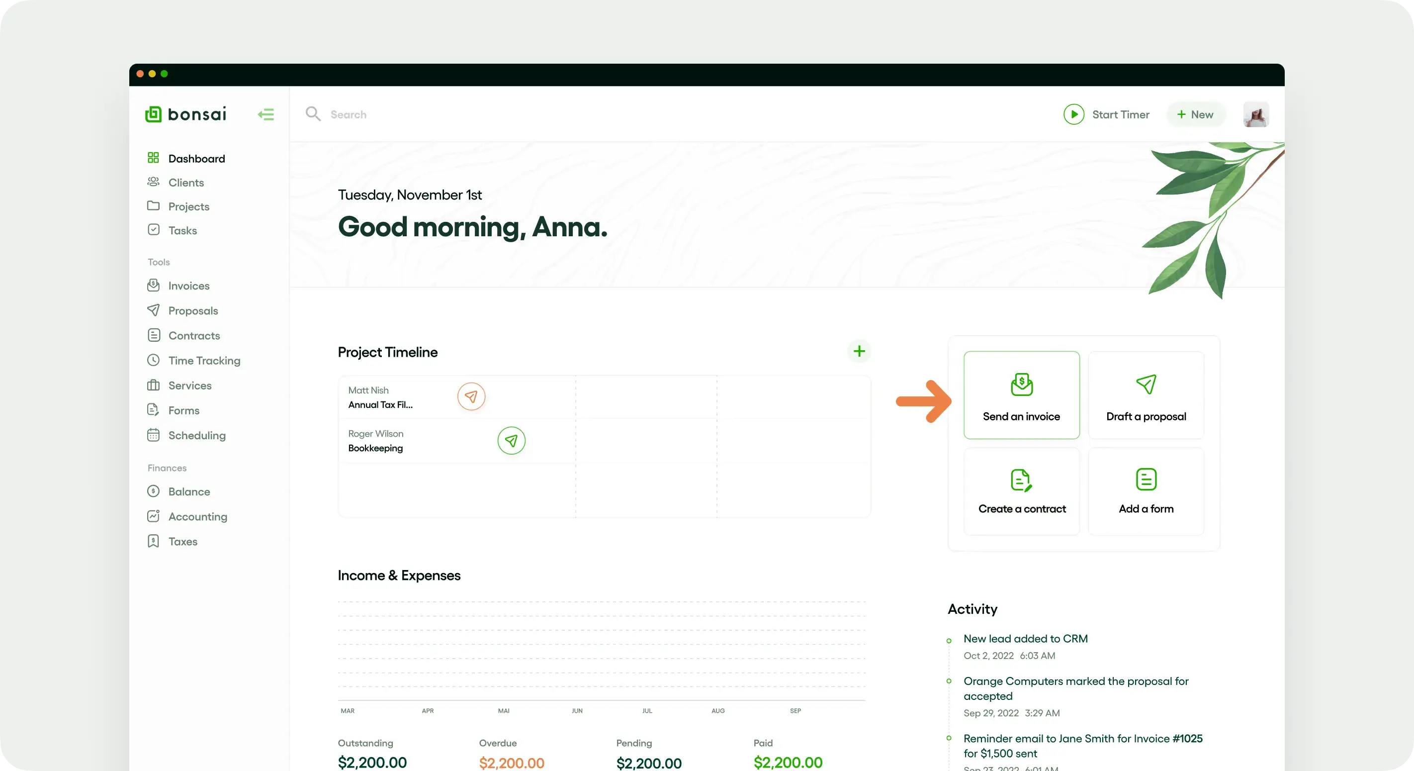 Avec Bonsai, vous pouvez créer rapidement et facilement un modèle de facture en cliquant sur « Envoyer une facture » depuis votre tableau de bord.