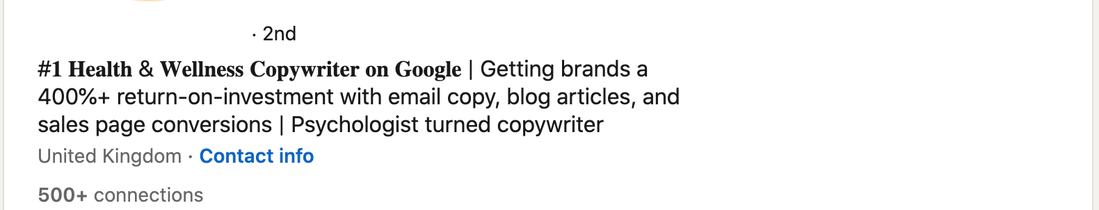 C'est un titre formidable, car il met l'accent sur les avantages et permet de comprendre clairement ce qu'il fait et avec qui il travaille. C'est ultra-spécifique. Cette personne a utilisé tout l'espace disponible dans la section titre pour se mettre en avant.