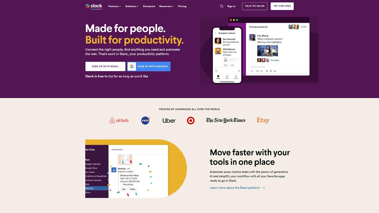 Slack utilise l'IA pour fournir des solutions supplémentaires visant à améliorer la productivité, telles que la synthèse de longs fils de discussion ou la recherche de mots-clés spécifiques dans les conversations. Comme toutes les conversations sont clairement visibles dans leurs canaux appropriés, cette application contribue à améliorer la responsabilité et la transparence. Il est facile de communiquer les besoins individuels et ceux de l'équipe, qu'il s'agisse de planifier des réunions hebdomadaires ou de synchroniser les tâches à accomplir dans tout un domaine.