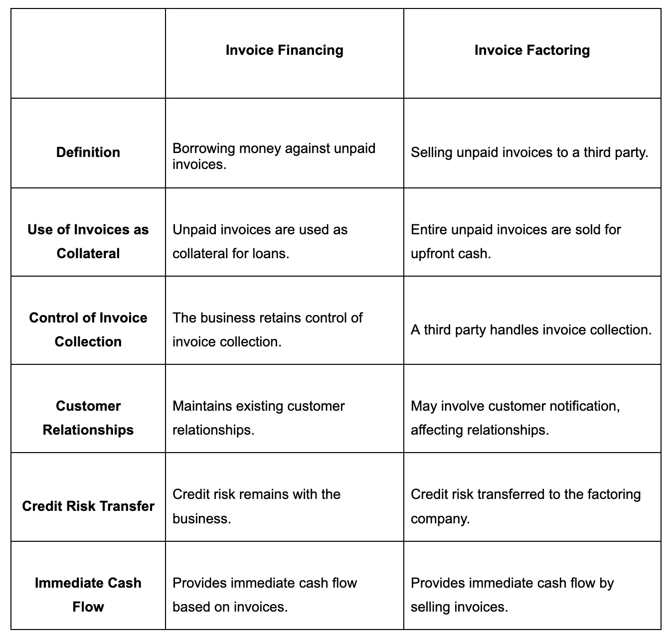 Si le financement des factures et l'affacturage sont deux options qui s'offrent à une entreprise ayant besoin d'un accès immédiat à des liquidités, il existe toutefois des différences entre les deux.