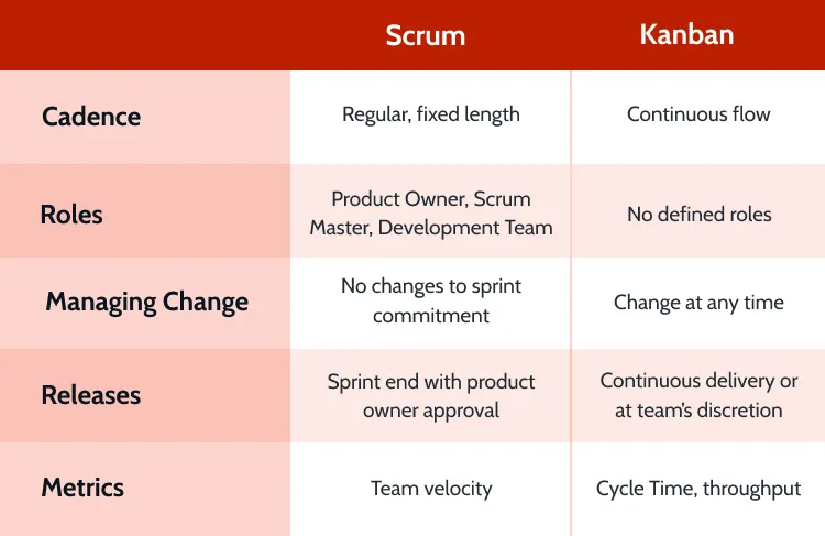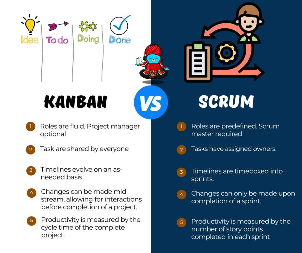 - Scrum fonctionne par sprints à durée déterminée, tandis que Kanban se concentre sur la livraison continue.