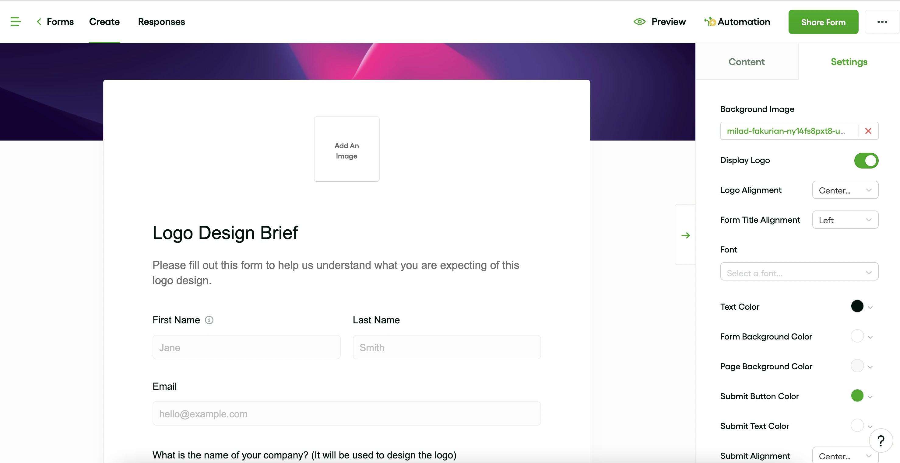 Ensuite, vous verrez le questionnaire, ainsi que la possibilité de le personnaliser davantage avec un arrière-plan ou un logo, par exemple. Configurez-les et continuez à faire défiler vers le bas.