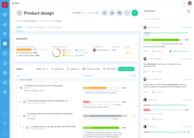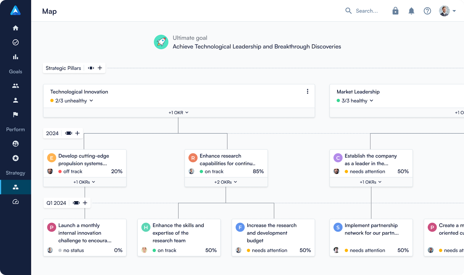 Grâce à ses fonctionnalités permettant de suivre les progrès par rapport aux OKR spécifiés, Perdoo vous permet de surveiller facilement le taux d'achèvement des projets. Son approche agile de gestion de projet favorise l'adaptabilité, aidant votre équipe à gérer efficacement les résultats et les risques liés au projet. Ainsi, Perdoo ne sert pas seulement de méthodologie technologiquement avancée pour la définition d'objectifs, mais augmente également la productivité et les performances globales.