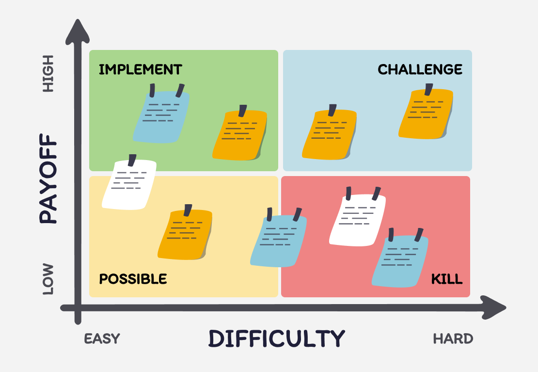 Les facteurs pris en compte comprennent généralement la facilité de mise en œuvre et le retour sur investissement potentiel. Classer chaque idée de cette manière permet de prévoir la facilité/le coût de mise en œuvre par rapport aux avantages potentiels. En corrélation avec les principes du Lean Manufacturing et du Six Sigma, cela peut rationaliser la prise de décision, stimuler l'efficacité et maximiser la productivité.