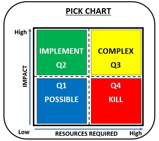 Des outils tels que Lean Six Sigma jouent un rôle essentiel dans la création de graphiques PICK dans le cadre de la phase de mise en œuvre, tant dans le Lean Manufacturing que dans Six Sigma. Ces graphiques servent d'aide visuelle à la comparaison pour classer la facilité/le coût de mise en œuvre de diverses idées d'amélioration des processus, sur la base du retour sur investissement (ROI) estimé.