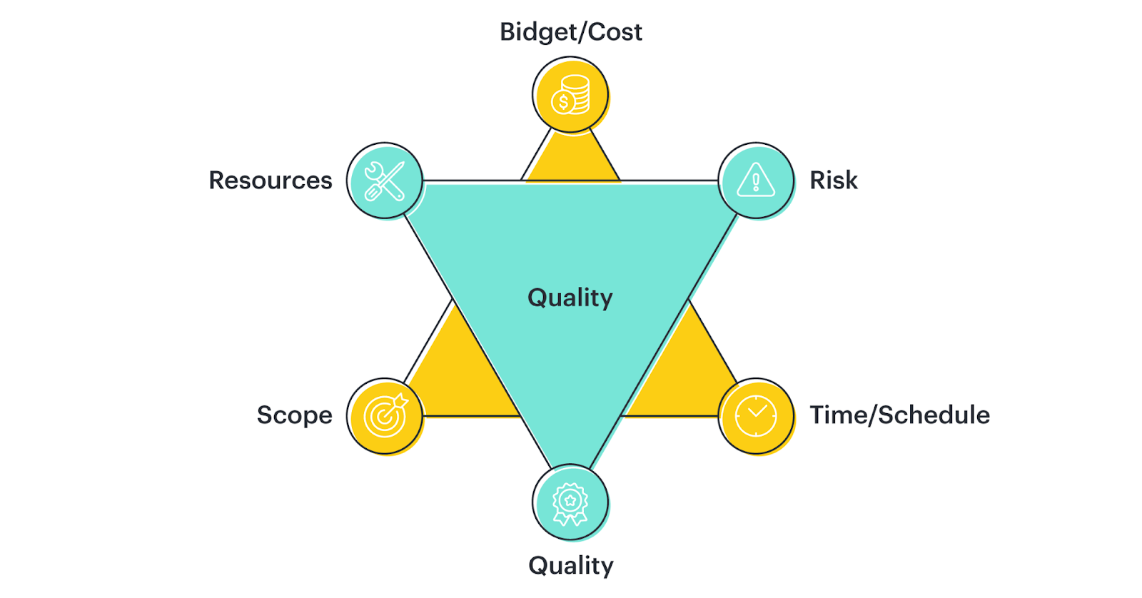 Les contrôles qualité font partie des contraintes qualité, évaluant à la fois le résultat final et la manière dont vous y êtes parvenu. Les risques comprennent tout obstacle potentiel susceptible de vous ralentir ou de vous coûter plus cher. Et en matière de gestion des ressources, il s'agit de tirer le meilleur parti de votre main-d'œuvre, de vos matériaux et de vos équipements.