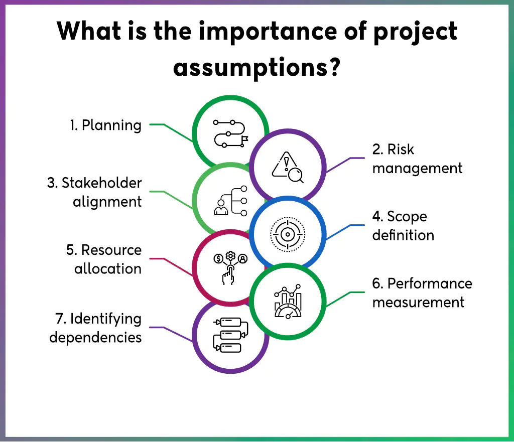 Les hypothèses sont essentielles à la réussite de la planification et de l'exécution. Si les hypothèses s'avèrent incorrectes, elles peuvent contribuer à augmenter les risques. Il est important de comprendre les dépendances au cours du cycle de vie, car cela aide à établir un calendrier et un budget réalistes. La gestion des risques implique la planification des contraintes potentielles. Il commence lors de l'initiation et se poursuit tout au long du projet afin de garantir la réalisation des livrables. Des révisions régulières sont essentielles pour vérifier que les hypothèses sont toujours valables et ajuster le plan si nécessaire.