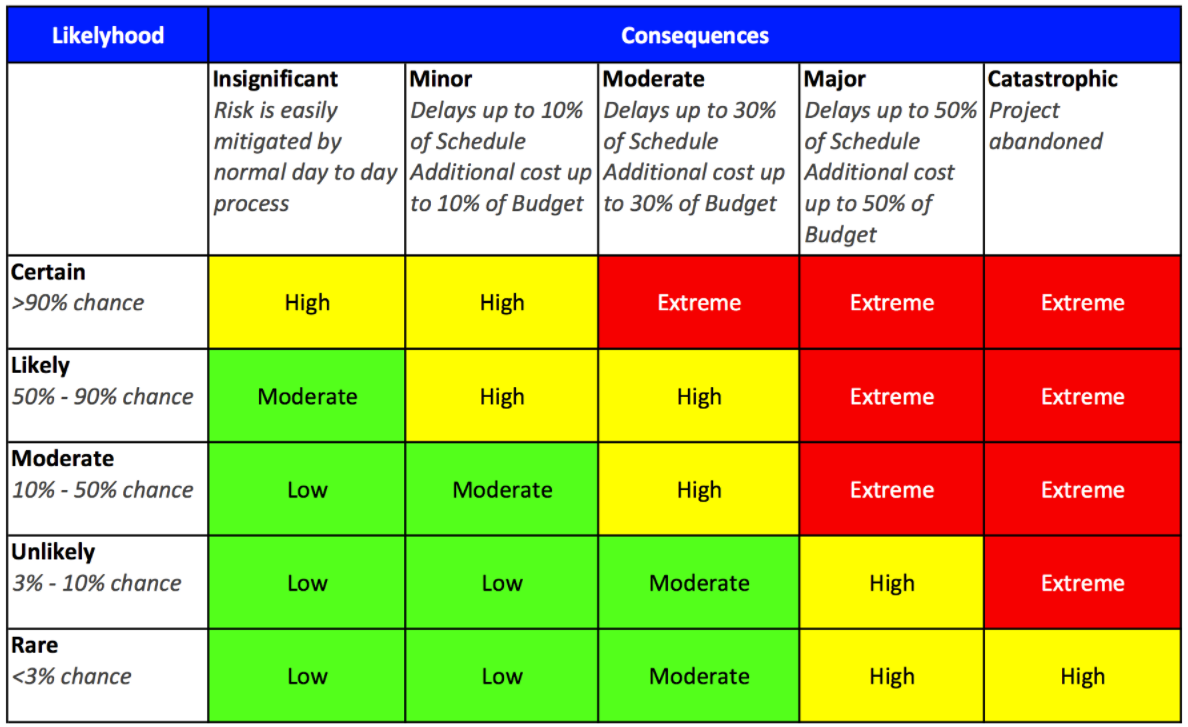 La gestion des risques est un concept important dans la gestion d'un projet, car il s'agit du processus visant à réduire les difficultés potentielles susceptibles d'avoir un impact négatif sur un projet. Les risques identifiés sont systématiquement consignés dans un registre des risques, puis regroupés par catégories de risques, avant d'être coordonnés par une personne, le responsable des risques, qui est chargé de veiller à la mise en œuvre du plan de réponse aux risques. La gestion des risques liés aux projets comprend l'identification des risques, l'analyse des risques et l'atténuation des risques. Ces processus sont menés par un cadre de gestion des risques qui joue un rôle différent dans le processus de gestion des risques. Une gestion des risques adéquate est mise en œuvre à l'aide d'un outil de gestion des risques qui sensibilise les parties prenantes du projet aux menaces potentielles et leur permet de mieux comprendre si le projet est sûr ou non.