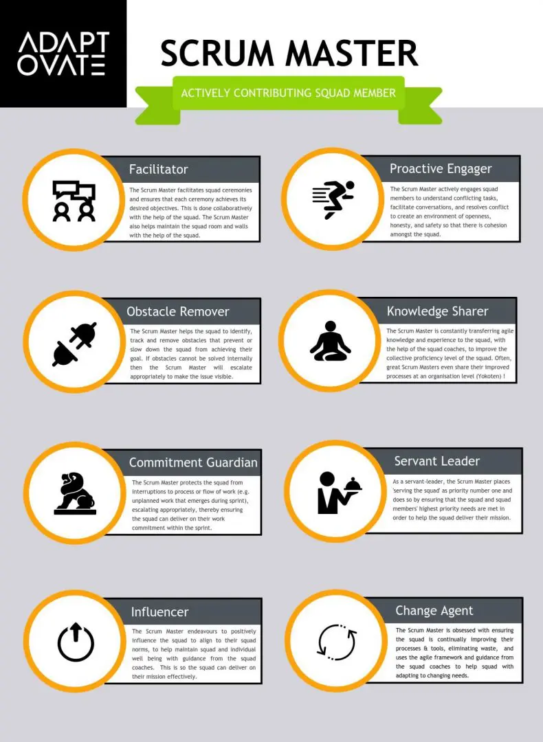Dans le cadre agile, le Scrum Master joue un rôle central dans les cérémonies Scrum. Au cours des réunions de planification des sprints, ils aident le propriétaire du produit et l'équipe de développement à créer le backlog du sprint à partir du backlog du produit. Ils facilitent les réunions quotidiennes debout ou le Scrum quotidien, garantissant la collaboration de l'équipe et le suivi des progrès.