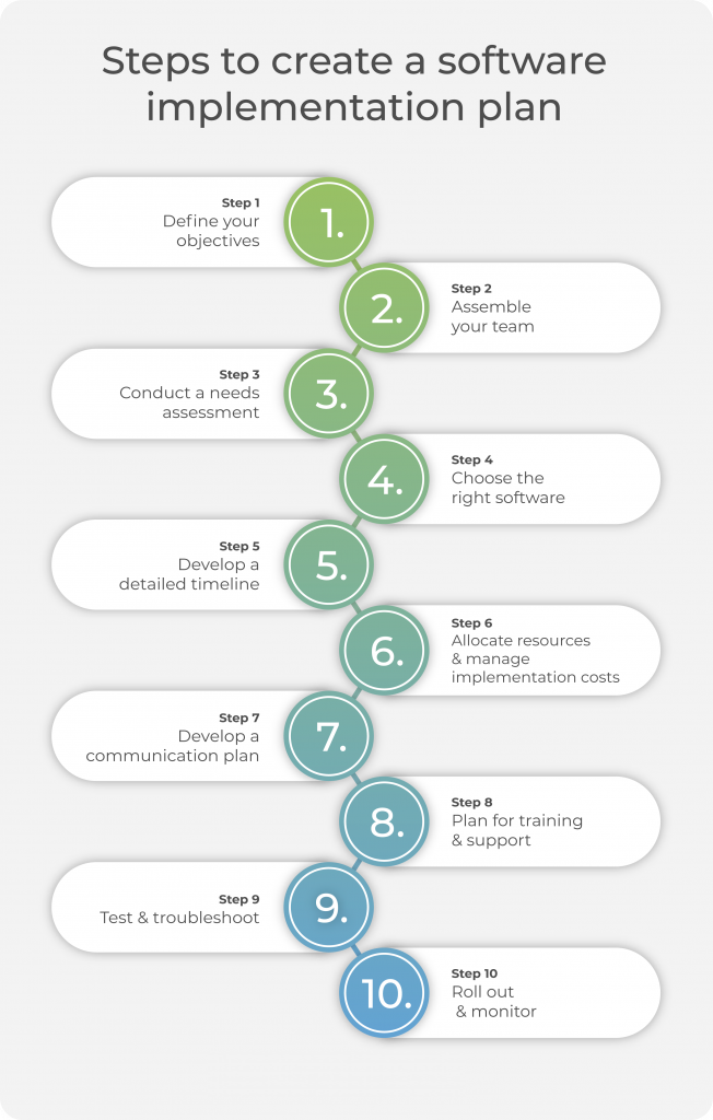 Next, assemble an implementation team and develop a communication management strategy. The team should consist of specialists in software upgrades, testing, and end-user training. It is also crucial to involve the software vendor for support and guidance during this stage.