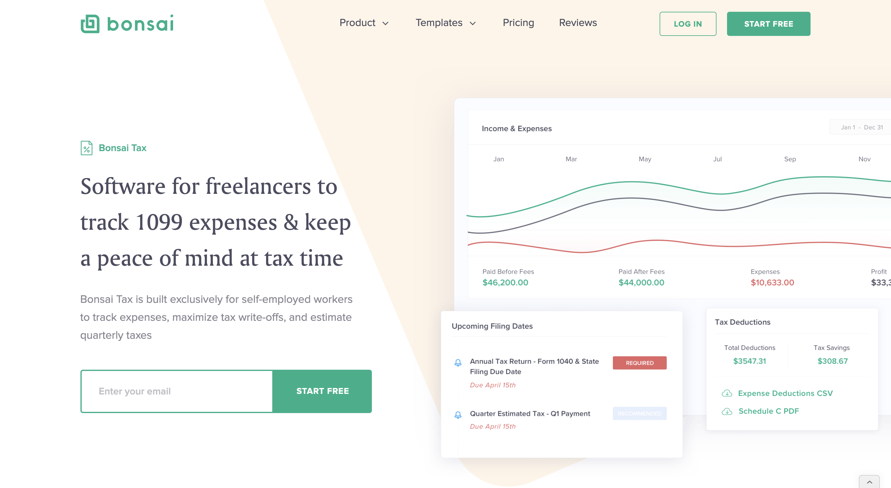 Remarque : Si vous recherchez un moyen infaillible de gérer vos impôts en tant qu'entrepreneur individuel, essayez Bonsai Tax. Notre logiciel fiscal peut vous aider à estimer vos impôts, vous envoyer des rappels de déclaration et suivre toutes vos déductions fiscales. En fait, la majorité des utilisateurs économisent 5 600 $ sur leur facture fiscale. Essayez dès aujourd'hui un essai gratuit de 7 jours dès aujourd'hui.
