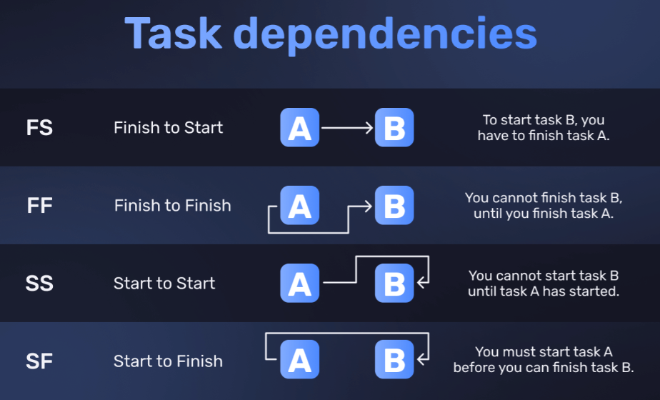 On peut affirmer sans risque de se tromper que « le succès de la gestion de projet dépend en grande partie de la compréhension et de la gestion efficace des dépendances entre les tâches ». Il est incontestable qu'ils jouent un rôle essentiel dans l'exécution des tâches et la formulation du plan du projet, en façonnant le calendrier du projet en établissant les relations entre les tâches.