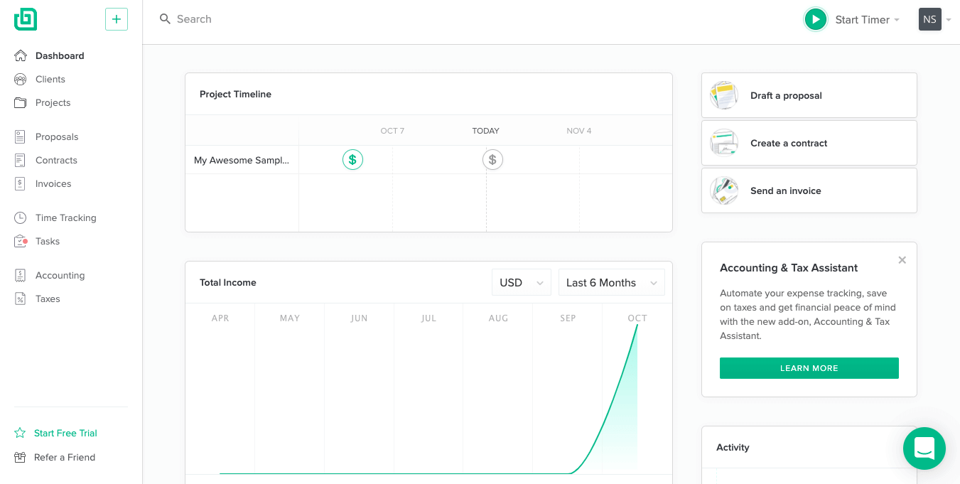 Bonsai Tax has a simple appeal: it offers more bang for your buck than most tax software. Not only does it make claiming tax write-offs more straightforward, but the freelancer app also provides other features that make your solopreneur life much easier. Some of these features include: