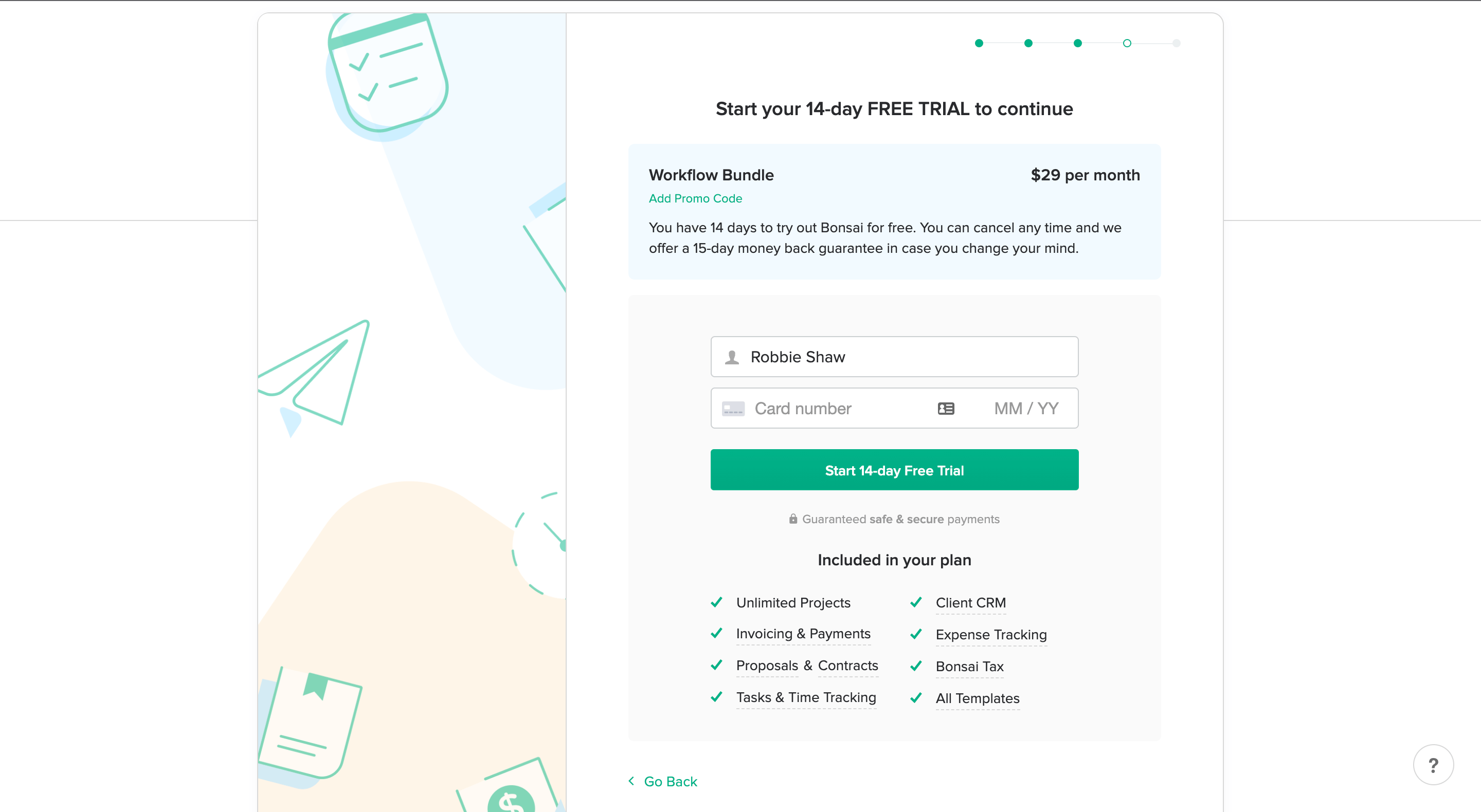 Bonsai's business account is part of the all-in-one business suite Bonsai. You will begin your 7-day free trial now by entering your credit card details.