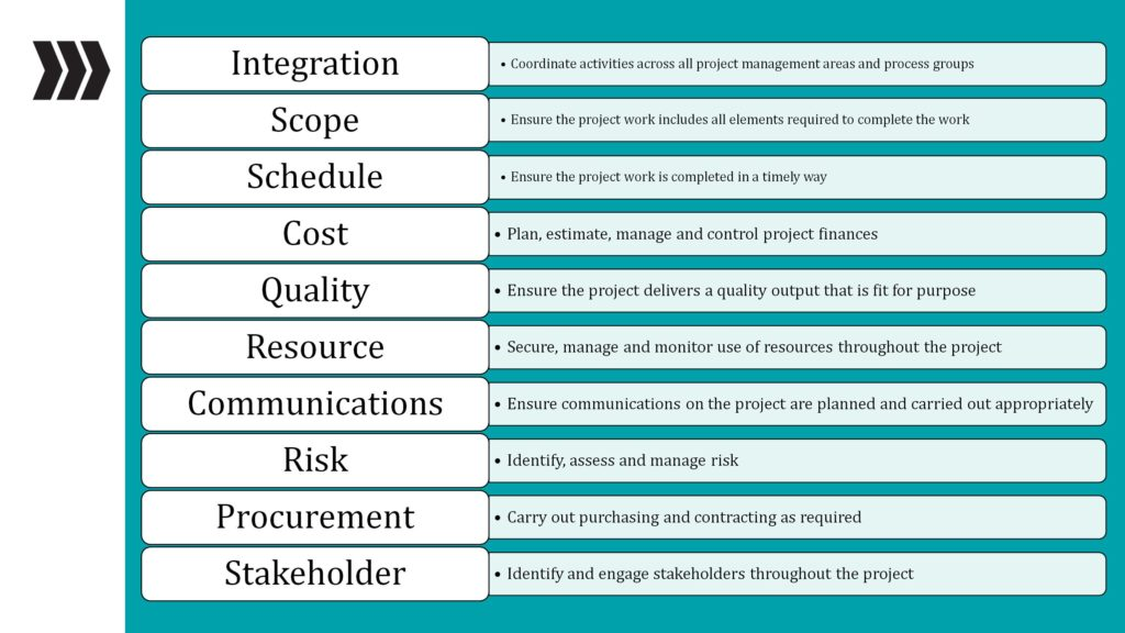 Il est intéressant de noter que les dix domaines de connaissances en gestion de projets constituent des aspects clés du guide PMBOK, qui vise à améliorer l'efficacité et l'efficience d'un projet. Le principal avantage de ces domaines est qu'ils incluent la portée du projet, le calendrier et la gestion des coûts, qui définissent les paramètres, le calendrier et les détails budgétaires d'un projet. Ce qui est étonnant, c'est que la terminologie standard et les meilleures pratiques sont respectées.