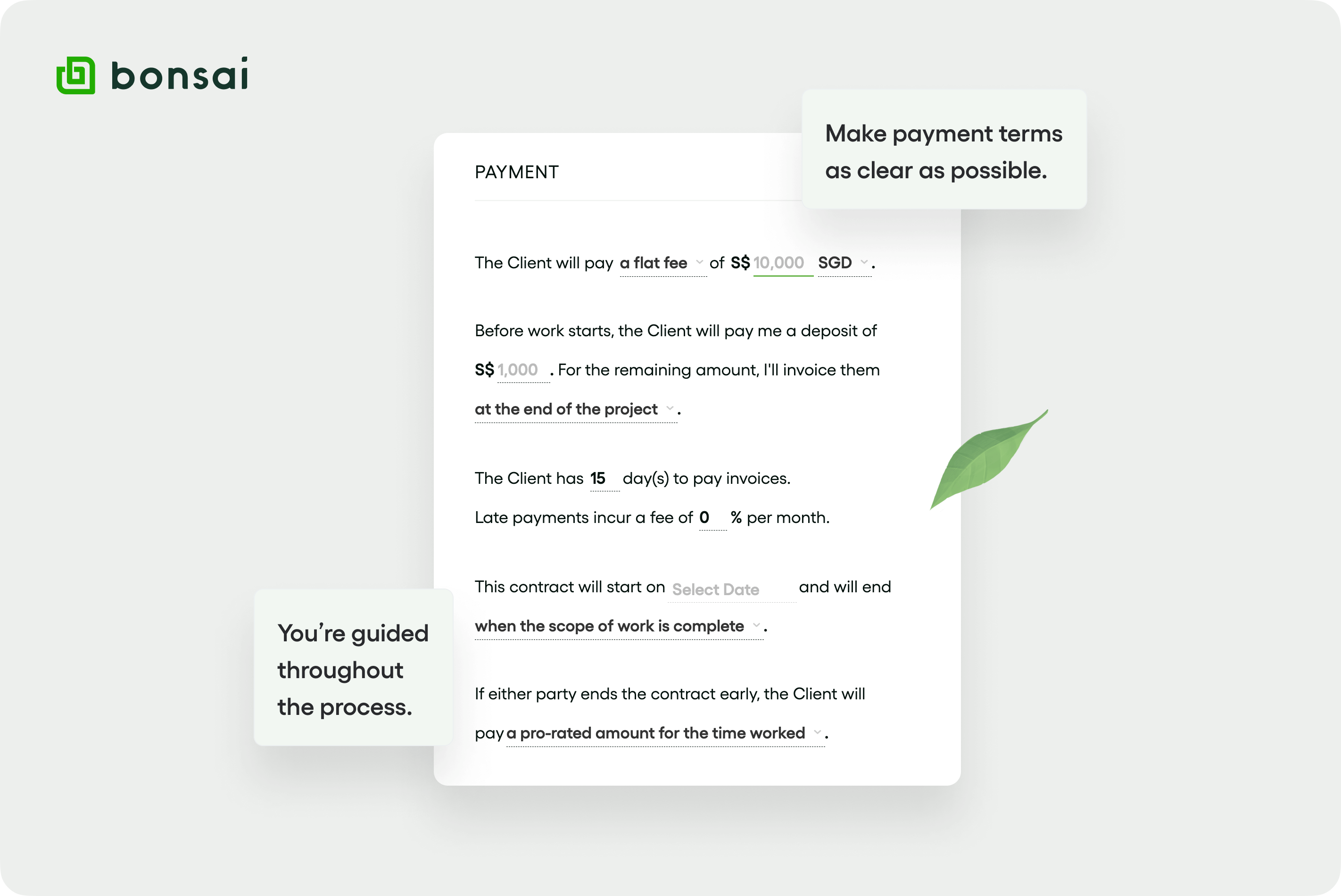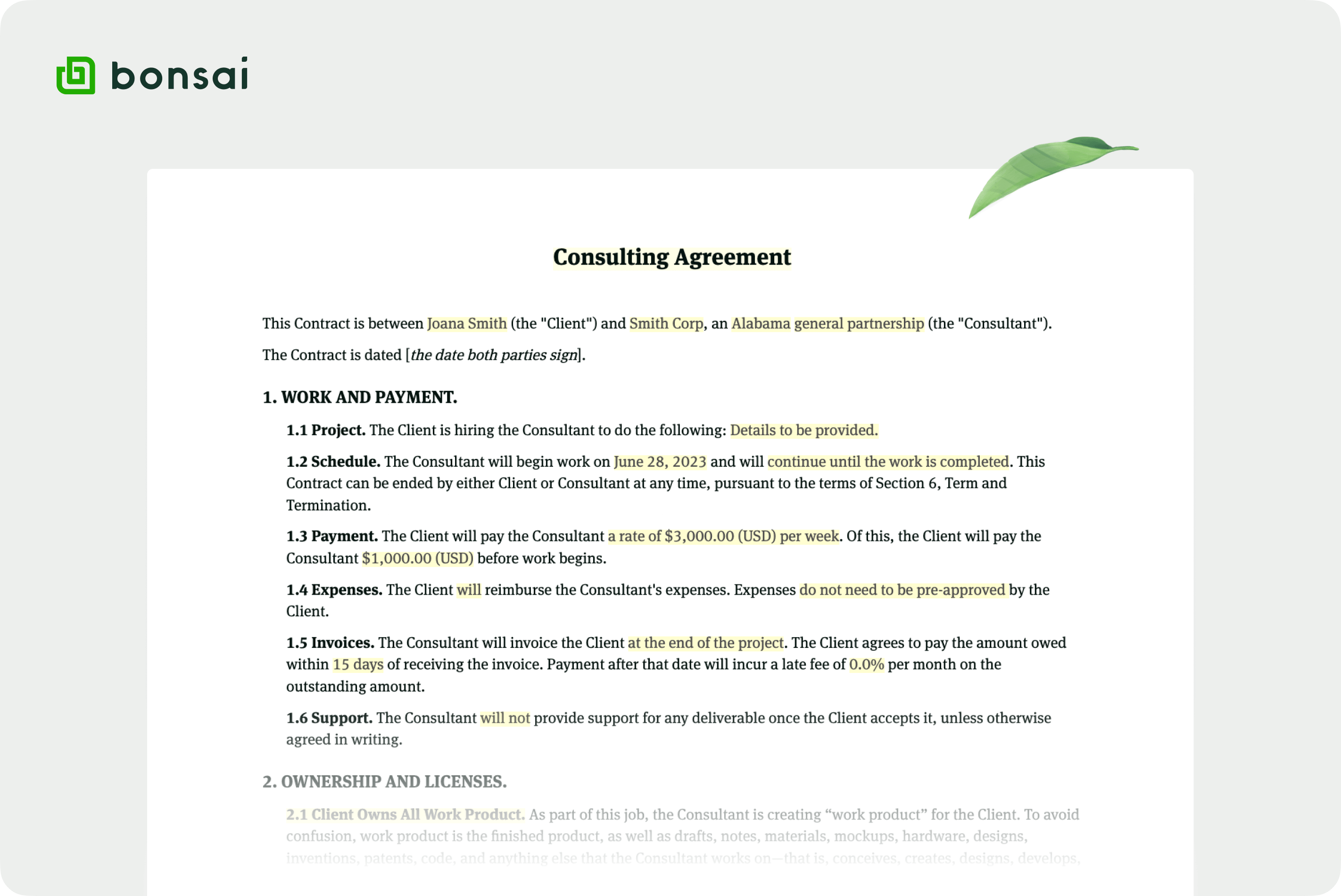 Remarque : Créez votre contrat à l'aide d'un modèle en ligne facile à utiliser et professionnel en vous inscrivant gratuitement dès aujourd'hui. Non seulement Bonsai propose une multitude de modèles d'accords et de contrats, mais il offre également une grande variété de modèles de propositions commerciales, de devis et de factures pour aider votre entreprise à fournir des documents d'aspect professionnel.